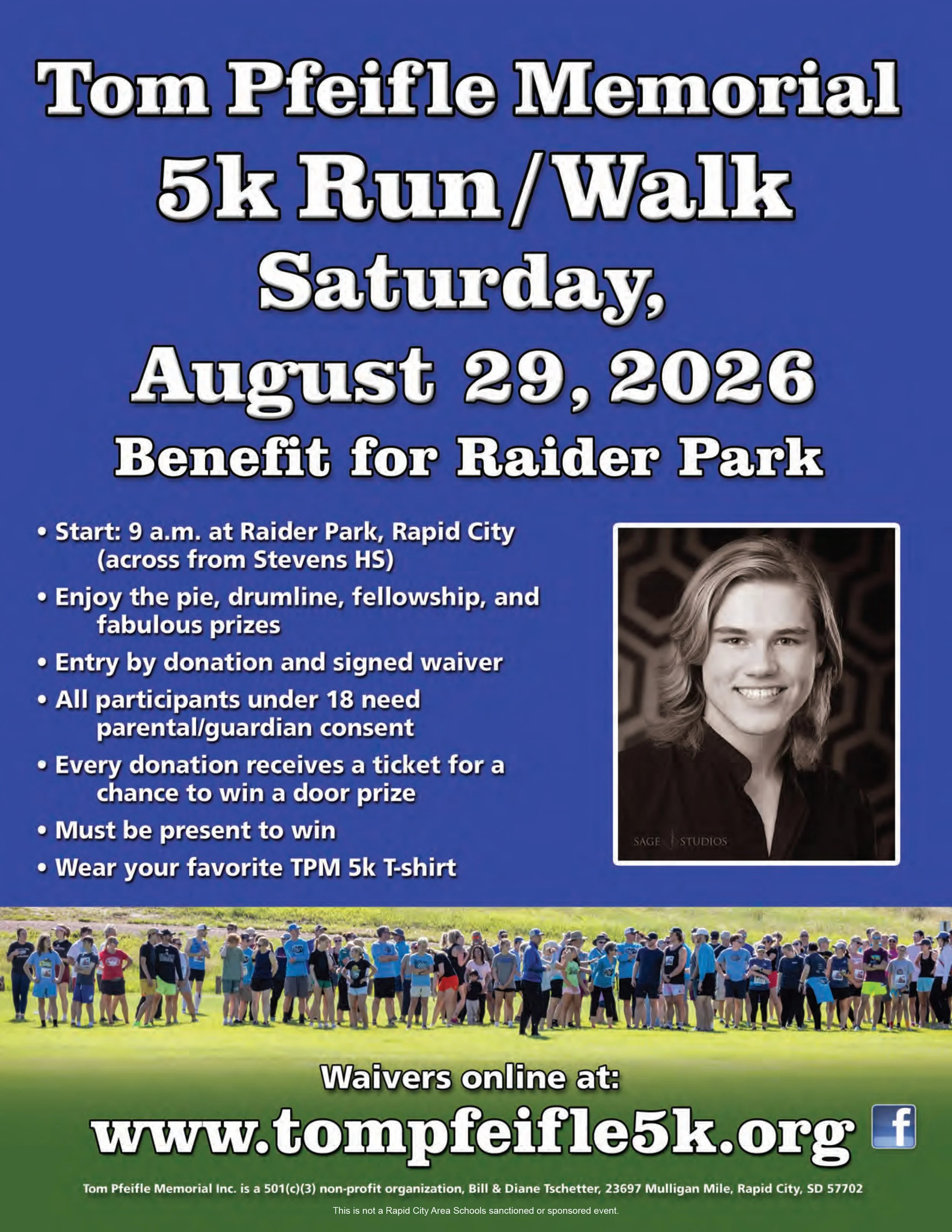 The annual Tom Pfeifle 5K Fun Run/Walk will be held Saturday, August 29, 2026 at Raider Park in Rapid City, SD at 9 AM.